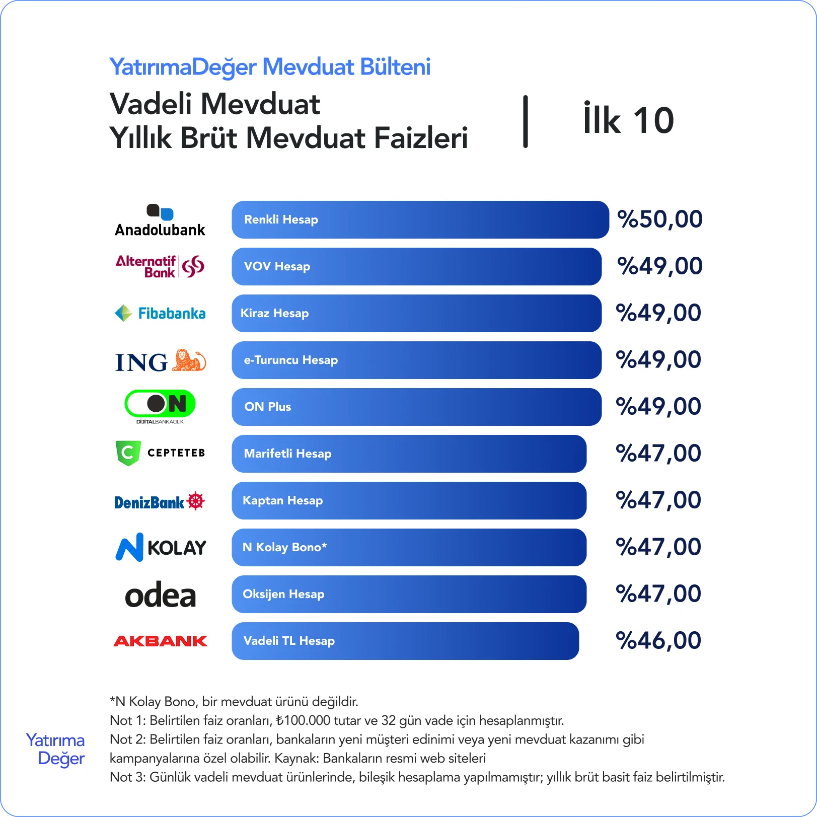 Vadeli mevduat için sıklıkla kullanılan vadeler: Gecelik, 32 gün, 92 gün, 181 gün ve 365 gün.